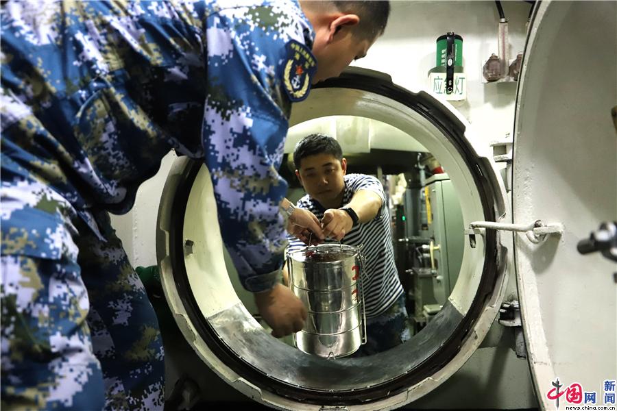 “嗒、嗒、嗒”艇员轻轻敲响水密门的小把手,邻舱战友非常默契地打开如同“呼啦圈”大小的水密门,接过传来的餐具;“非更艇员开饭”。