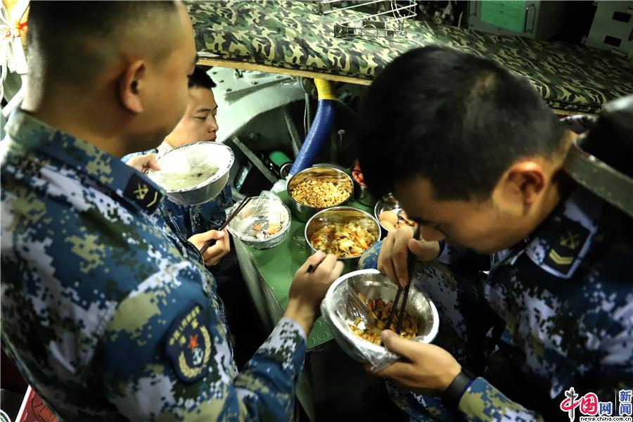 艇员们因地制宜选择就餐地点,只要不妨碍操纵,哪里都可以借来享受美味。