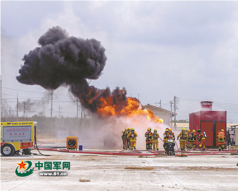 参演人员密切配合开展火灾救援演练。