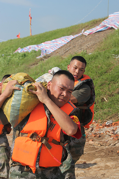 陆军第71集团军某旅“王杰班”官兵在江西九江涂山圩第9段大堤搬运沙袋加固堤坝(2020年7月22日摄)。新华社发(李志浩 摄)
