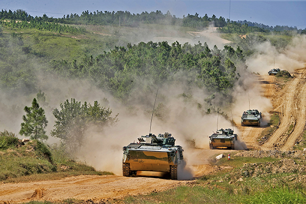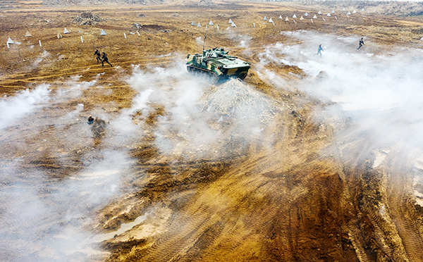 陆军第71集团军某旅“王杰班”官兵在皖北某驻训场进行步坦协同战术训练(2018年12月19日摄)。新华社发(李志浩 摄)