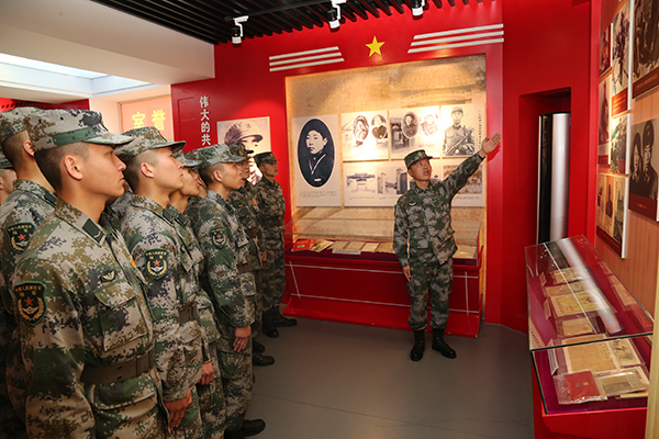 陆军第71集团军某旅“王杰班”班长王大毛(右)在连队荣誉室给新入伍的战友讲解王杰事迹(2019年4月5日摄)。新华社发(李志浩 摄)