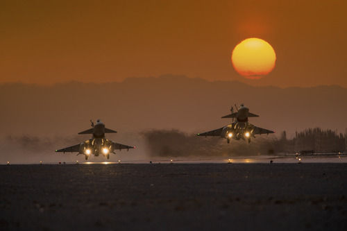 在空军某试验训练基地的训练场上,歼-10C战机进行跨昼夜对抗训练(2018年5月22日摄)。新华社发(杨军 摄)