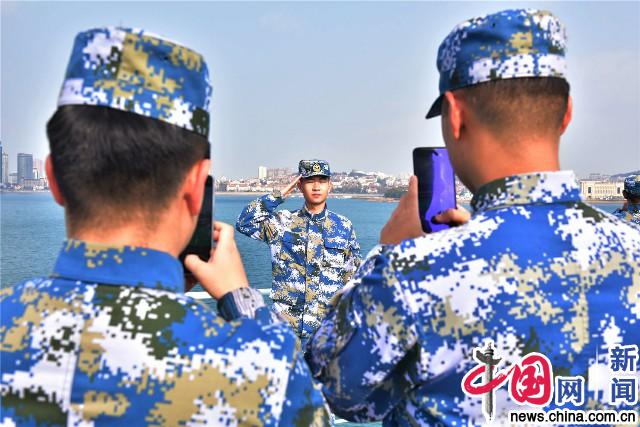 红瓦绿树、碧海蓝天,美丽的青岛是老兵们的第二故乡。作为退伍兵在海上观赏沿途风景,别有一番心境。此时军舰已经抵达本次活动的目的地——青岛栈桥风景区,老兵们纷纷拿出相机拍照合影。