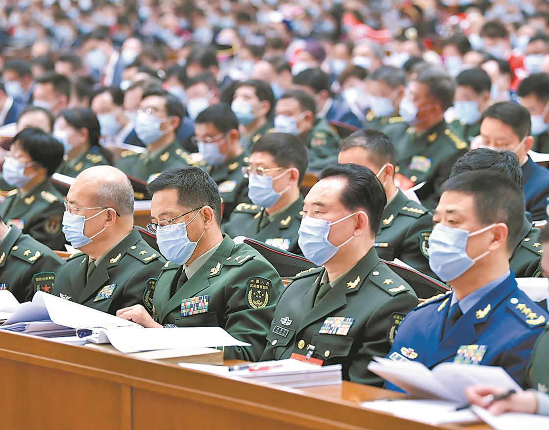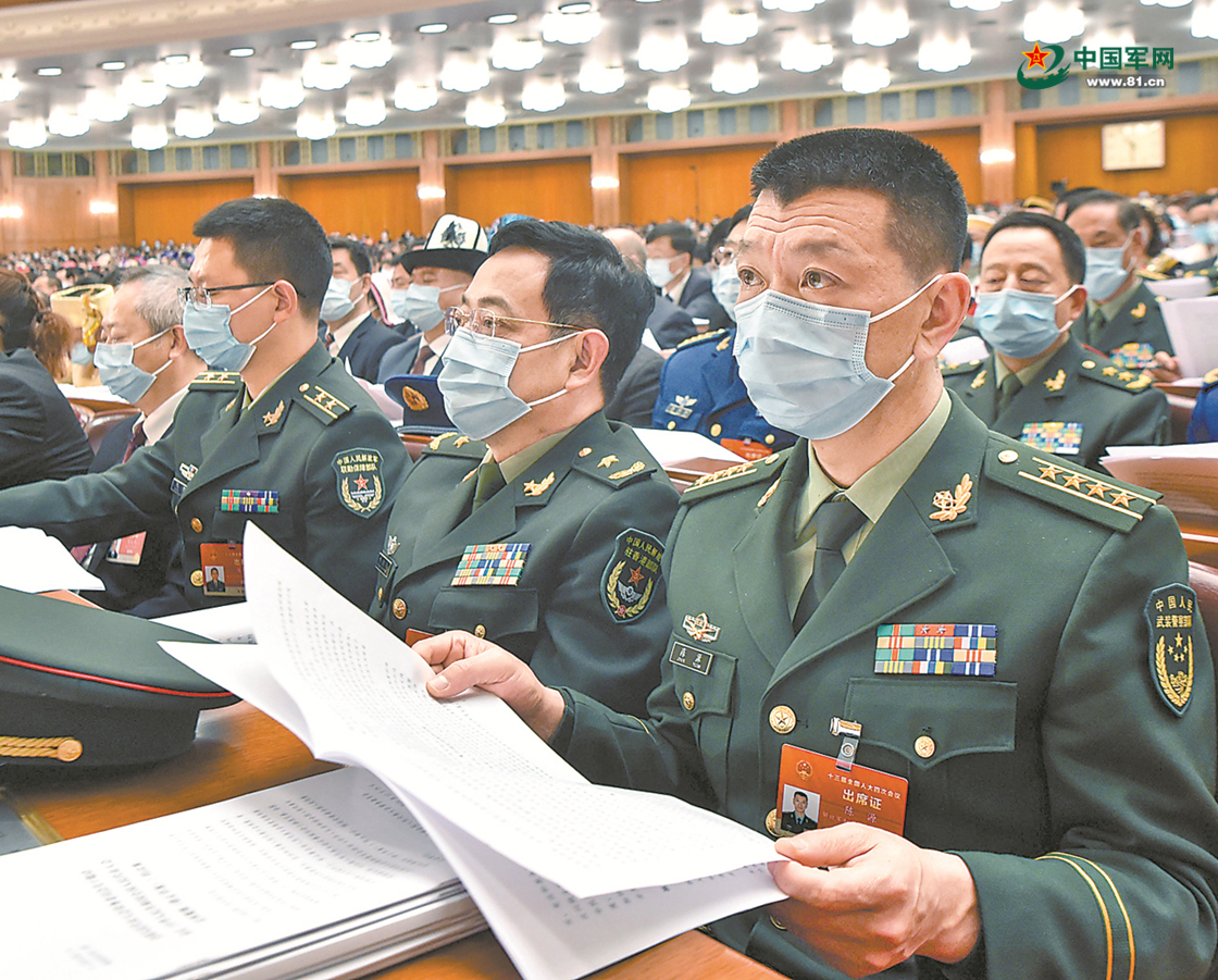 3月5日,十三届全国人大四次会议在北京人民大会堂开幕。图为军队人大代表认真听会。雷 声摄
