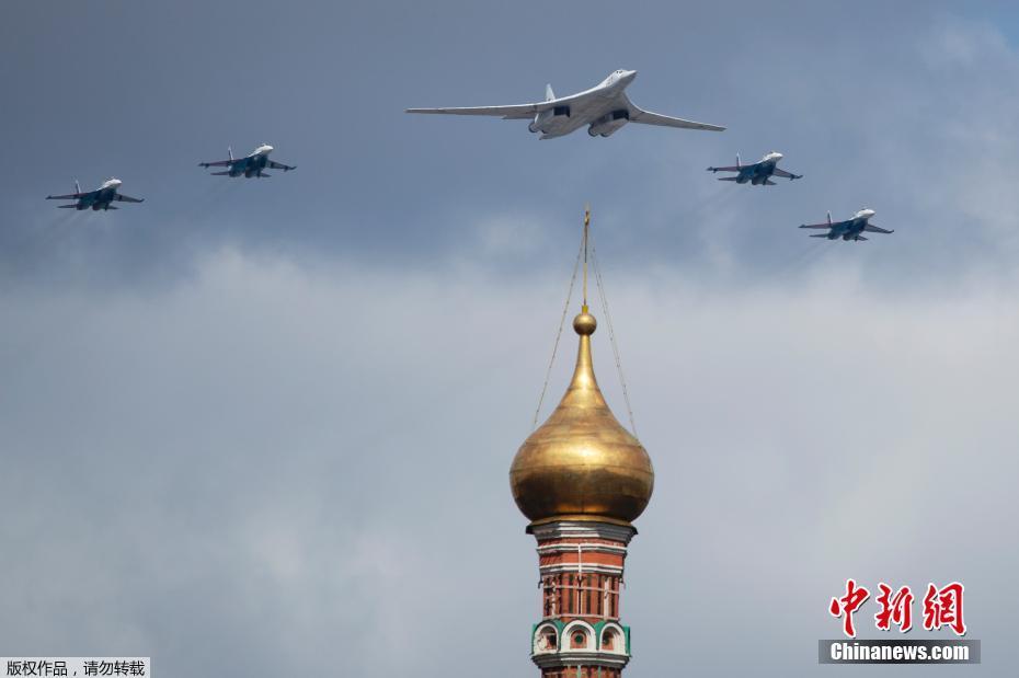 俄罗斯空军图-160战略轰炸机(前)在苏-35战斗机护航下经过巴兹尔大教堂。
