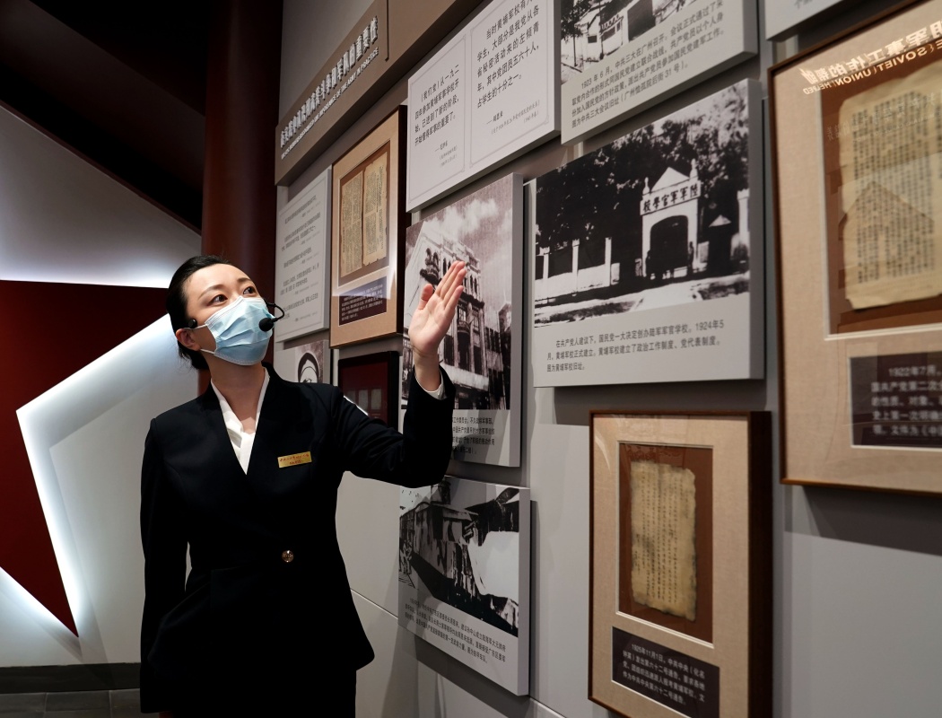 5月8日,在中共中央军委机关旧址纪念馆,讲解员在介绍展品。新华社记者 刘颖 摄