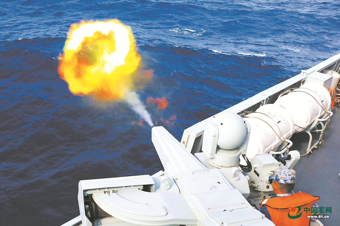 “发现‘敌’机一批两架……”主炮射击刚结束,新的“敌”情传来。编队立即组成防御队形,对空发射干扰弹形成多道防护网,有效干扰“敌”机来袭导弹。随即,编队展开集火攻击,一举摧毁“敌”机。