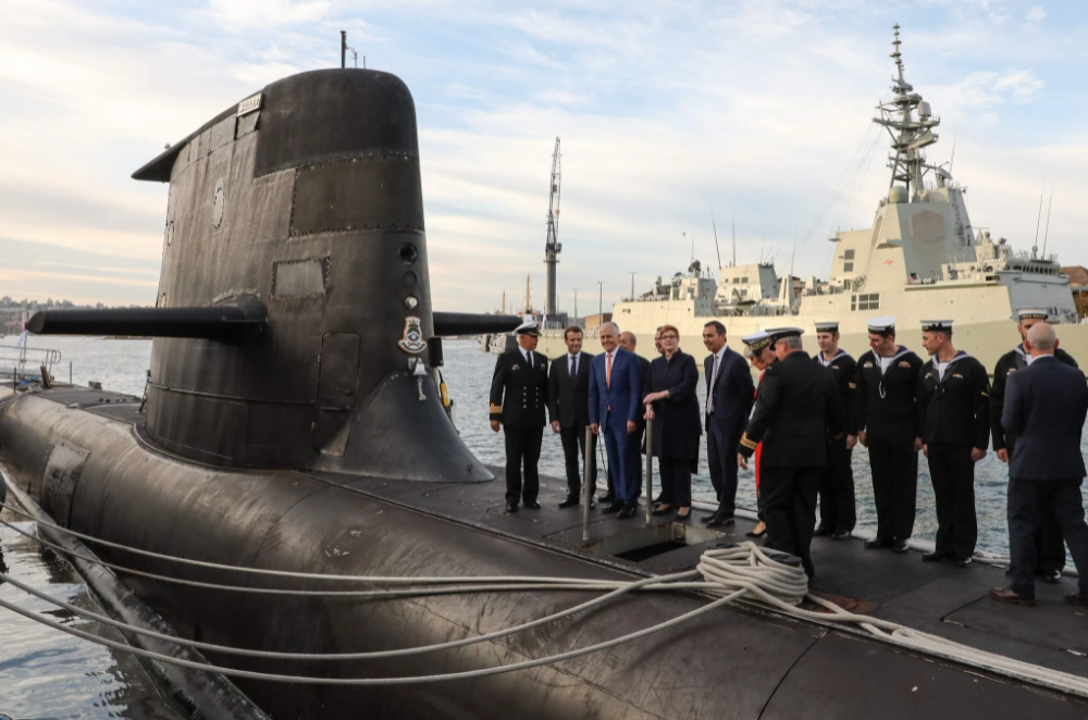法国总统马克龙在2018年访问澳大利亚期间与时任澳总理的特恩布尔一起登上澳军潜艇