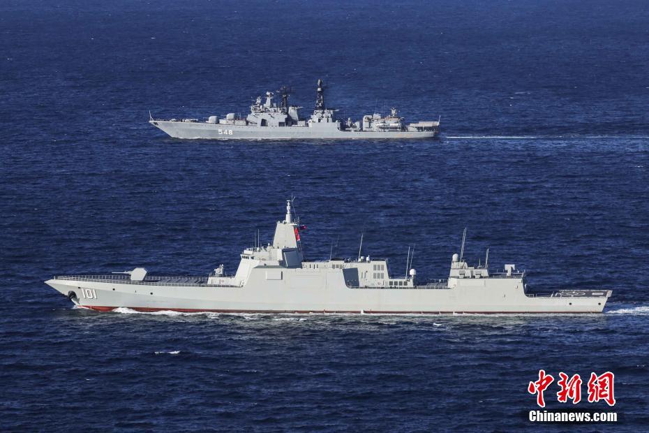 当地时间10月15日,中俄“海上联合—2021”演习进入实兵演练阶段,南昌舰和俄方大型反潜舰在联合机动。王游摄